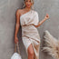 Deze elegante zomerjurk met een asymmetrische kraag en enkele mouw is perfect voor elke gelegenheid. De zachte satijnen stof en de geplooide rok geven je een verfijnde uitstraling.