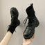 Ontdek deze stoere, zwarte boots met plateau. halfhoge hak en met een comfortabele rubberen zool. Dankzij de stevige blokhak loop je comfortabel en stabiel. Deze toffe enkellaarzen hebben een ronde voorkant, een elastische stof rondom de kuiten en ze hebben veters. Super tijdloos en stoer!